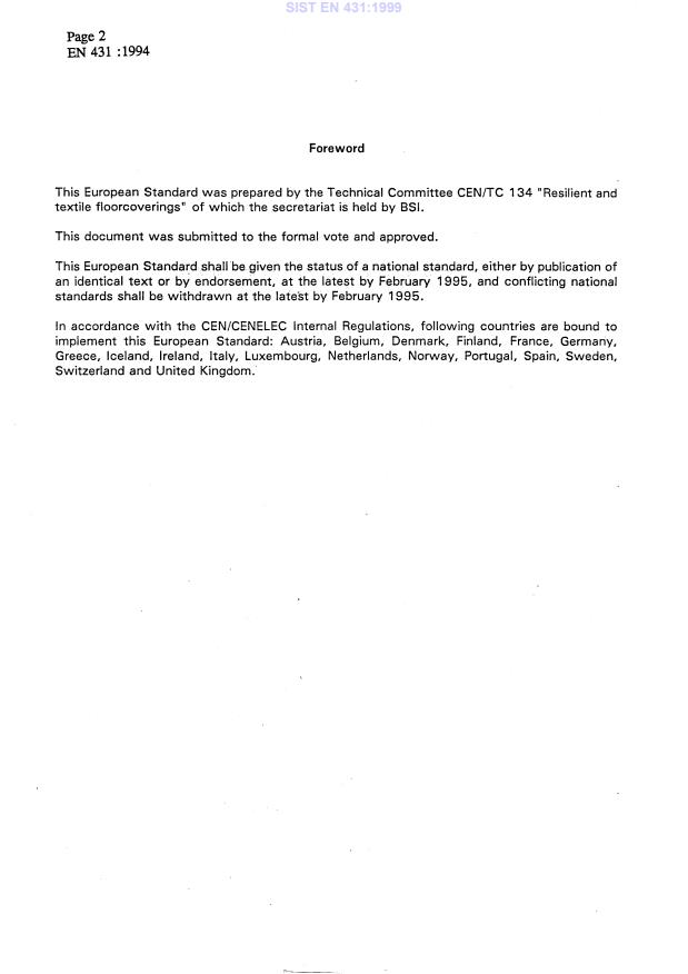 EN 431:1994 is a standard published by the European Committee for Standardization (CEN). Its full title is "Resilient floor coverings - Determination of peel resistance". This standard covers: This European Standard specifies a method for determining the resistance against separation of two layers of a resilient floor coverings by peeling.