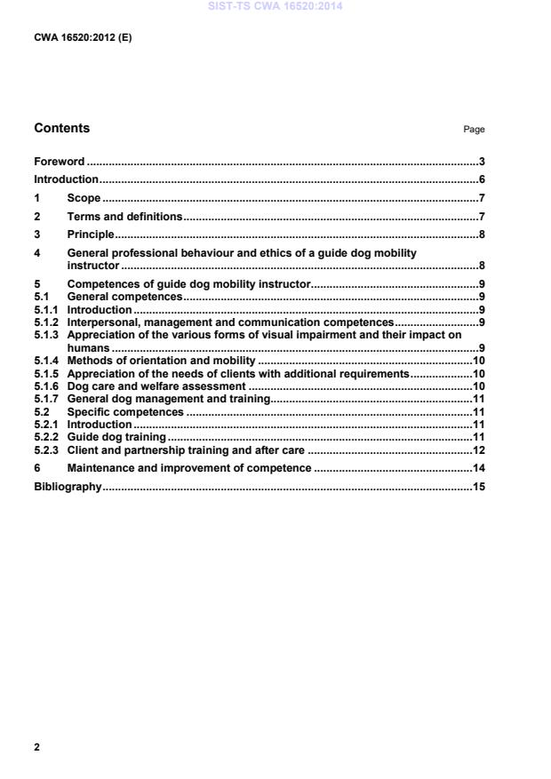 CWA 16520:2012 is a technical specification published by the European Committee for Standardization (CEN). Its full title is "Guide dog mobility instructor - Competences". This standard covers: This document provides the reference criteria of essential competences for guide dog mobility instructors in the following general and specific areas: professional behaviour and professional ethics; interpersonal management and communication competences; appreciation of the various forms of visual impairment and their impact on humans; methods of orientation and mobility; appreciation of the needs of clients with additional requirements; dog care and welfare assessment; general dog management and training; guide dog training; client and partnership training and after care.