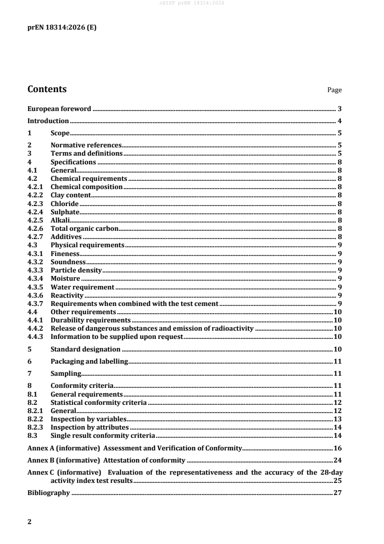 prEN 18314:2026 is a draft European Standard developed by CEN Technical Committee CEN/TC 104, focusing on natural pozzolana and natural activated pozzolanic materials. This standard sets out comprehensive requirements for the chemical and physical properties of these materials when used as additions in concrete, mortar, and grouts. It outlines definitions, technical specifications, and conformity criteria to ensure quality and consistent performance in building materials, supporting sustainable construction and the use of natural resources.