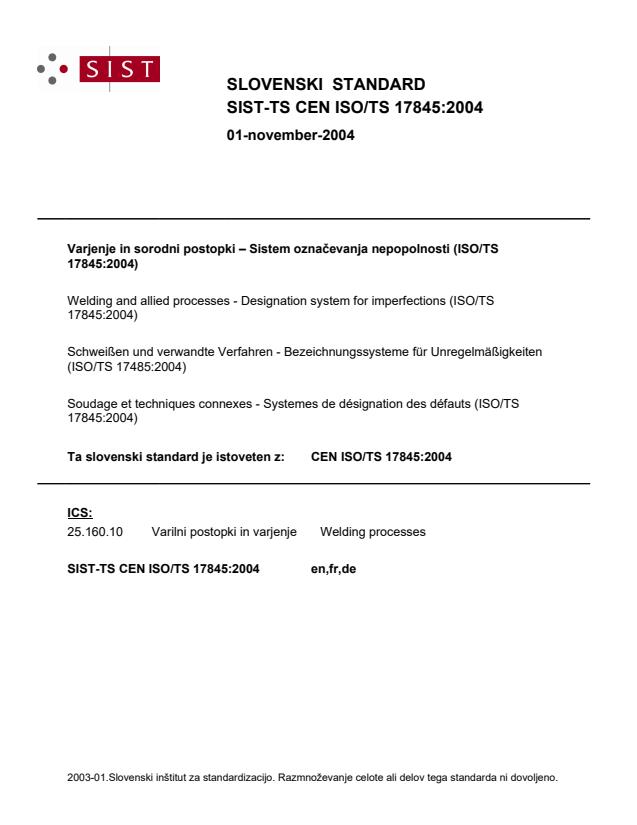 Varjenje in sorodni postopki – Sistem označevanja nepopolnosti (ISO/TS 17845:2004)