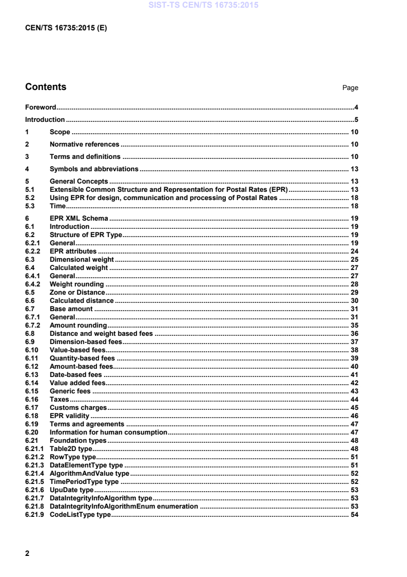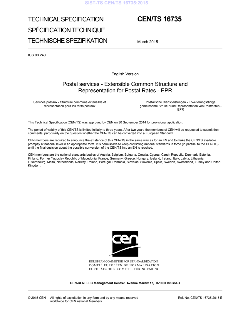CEN/TS 16735:2015 is a technical specification published by the European Committee for Standardization (CEN). Its full title is "Postal services - Extensible Common Structure and Representation for Postal Rates - EPR". This standard covers: This Technical Specification defines a uniform structure and meaning for the information that fully represents postal rates for a broad variety of postal products in all mail categories. The postal rates definition is viewed as an important interface between posts and their customers and as such will benefit from standardization. Such representation of postal rates allows automated systems to uniformly use postal rates as they are introduced for new products or updated for existing postal products by postal operators. A postal rate file (PRF) is an XML document, which fully describes postal products rates. It contains all necessary and sufficient information for both postal operators and their customers to efficiently create, respectively acquire, update and process postal product rates. The structure, types and constraints of XML elements in an XML document are defined by an XML schema. The Extensible Postal Rates (EPR) schema is the XML schema that governs Postal Rate Files. This Technical Specification contains a complete description of the EPR schema, its hierarchical structure, information types and semantics of its elements. This Technical Specification neither defines nor constraints how postal rates are created by postal operators but rather provide a powerful and flexible tool that supports efficient rates definition, management and distribution. This Technical Specification does not define communication protocols that can be used by posts to distribute postal rates files to their customers. Suitable communication protocols are typically well known and already standardized (for example: Web Services, File Transport Protocol, email, etc.). The standard also does not define valuation of postal products as applied by postal operators and their customers.