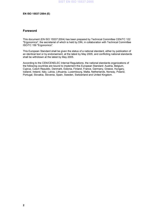EN ISO 15537:2004 is a standard published by the European Committee for Standardization (CEN). Its full title is "Principles for selecting and using test persons for testing anthropometric aspects of industrial products and designs (ISO 15537:2004)". This standard covers: ISO 15537:2004 establishes methods for determining the composition of groups of persons whose anthropometric characteristics are to be representative of the intended user population of any specific object under test. ISO 15537:2004 is applicable to the testing of anthropometric aspects of industrial products and designs having direct contact with the human body or dependent on human body measurements, e.g. machinery, work equipment, personal protective equipment (PPE), consumer goods, working spaces, architectural details or transportation equipment. ISO 15537:2004 is also applicable to the testing of such safety aspects of products that are dependent on human body measurements. It does not deal with other aspects of the task or other requirements, such as perception of information (except geometrical arrangement of the viewing targets) and the use of controls (except their geometrical placement).