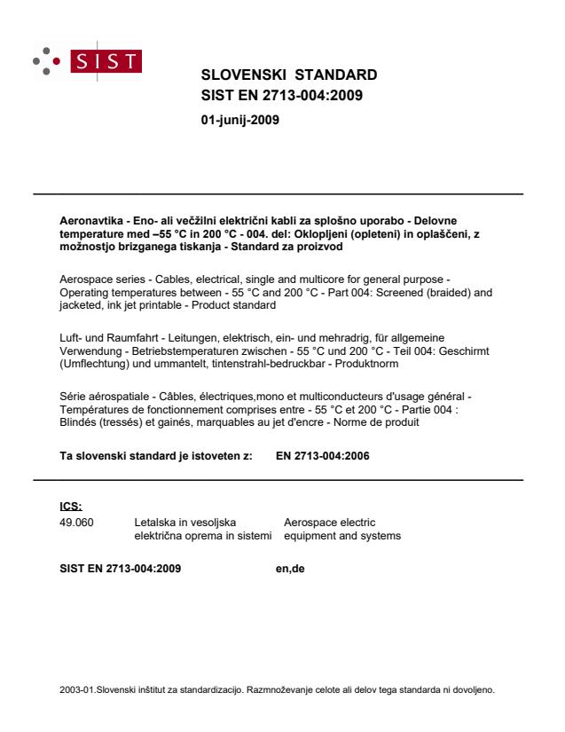 2003-01.Slovenski inštitut za standardizacijo. Razmnoževanje celote ali delov tega standarda ni dovoljeno.Luft- und Raumfahrt - Leitungen, elektrisch, ein- und mehradrig, für allgemeine Verwendung - Betriebstemperaturen zwischen - 55 °C und 200 °C - Teil 004: Geschirmt (Umflechtung) und ummantelt, tintenstrahl-bedruckbar - ProduktnormSérie aérospatiale - Câbles, électriques,mono et multiconducteurs d'usage général - Températures de fonctionnement comprises entre - 55 °C et 200 °C - Partie 004 : Blindés (tressés) et gainés, marquables au jet d'encre - Norme de produitAerospace series - Cables, electrical, single and multicore for general purpose - Operating temperatures between - 55 °C and 200 °C - Part 004: Screened (braided) and jacketed, ink jet printable - Product standard49.060Aerospace electric equipment and systemsICS:Ta slovenski standard je istoveten z:EN 2713-004:2006SIST EN 2713-004:2009en,de01-junij-2009SIST EN 2713-004:2009SLOVENSKI