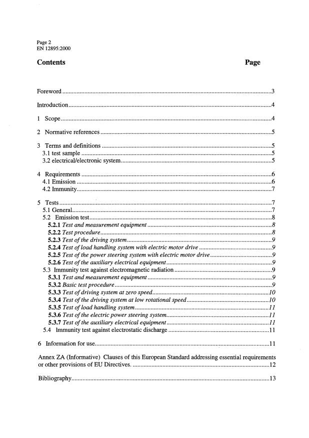 EN 12895:2000 is a standard published by the European Committee for Standardization (CEN). Its full title is "Industrial trucks - Electromagnetic compatibility". This standard covers: This standard applies to industrial trucks regardless of the power source (called only trucks) as defined in ISO 5053, variable reach trucks and their electrical/electronic systems when used in Residential, Commercial, Light Industry and Industrial Environment (see EN 50081-1:1992 and EN 61000-6-2:1999). This standard defines : - the requirements and the limit values for electromagnetic emission and immunity ; - the procedure and criteria for testing trucks and their electrical/electronic systems. This standard does not cover: - trucks intended for use outside the electromagnetic environments specified above; - trucks intended for use on public highway with maximum speed exceeding 25 km/h; - driverless industrial trucks and their systems;- interaction between systems on the trucks; - interference to on-board radio equipment; - equipment connected to AC-mains which is only used when the truck is not being operated (e.g. on board charger)