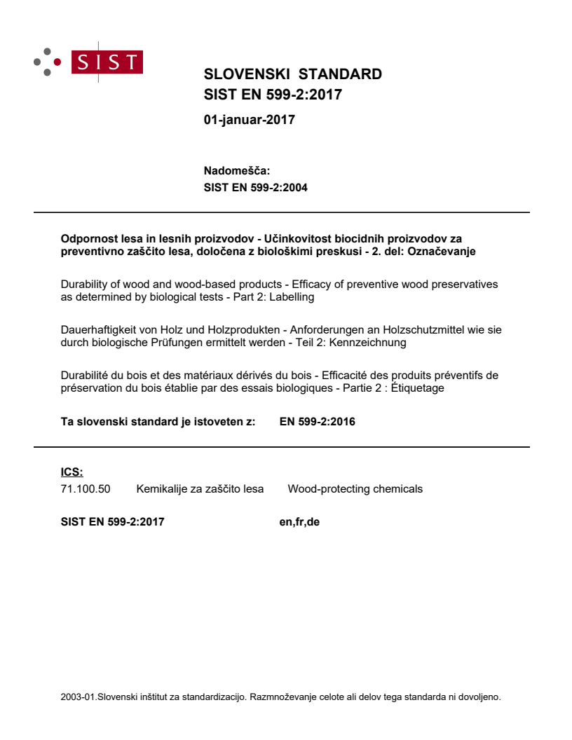 2003-01.Slovenski inštitut za standardizacijo. Razmnoževanje celote ali delov tega standarda ni dovoljeno.Dauerhaftigkeit von Holz und Holzprodukten - Anforderungen an Holzschutzmittel wie sie durch biologische Prüfungen ermittelt werden - Teil 2: KennzeichnungDurabilité du bois et des matériaux dérivés du bois - Efficacité des produits préventifs de préservation du bois établie par des essais biologiques - Partie 2 : ÉtiquetageDurability of wood and wood-based products - Efficacy of preventive wood preservatives as determined by biological tests - Part 2: Labelling71.100.50Wood-protecting chemicalsICS:Ta slovenski standard je istoveten z:EN 599-2:2016SIST EN 599-2:2017en,fr,de01-januar-2017SIST EN 599-2:2017SLOVENSKI