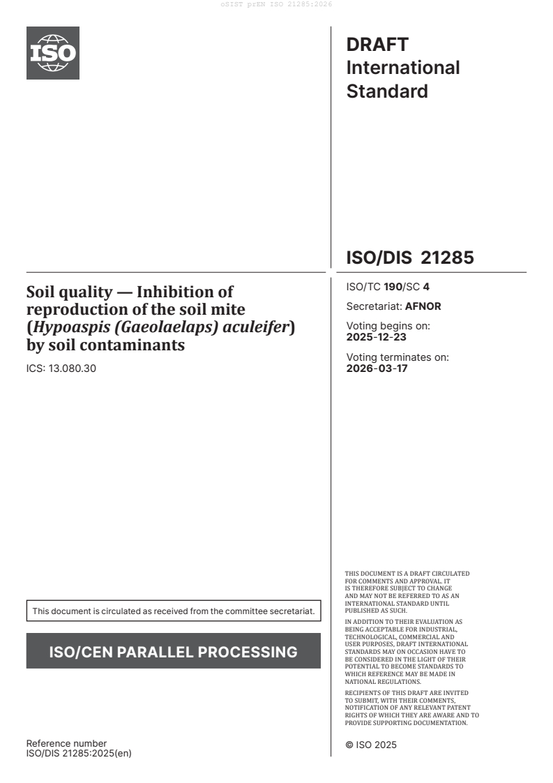 Soil quality - Inhibition of reproduction of the soil mite (Hypoaspis (Gaeolaelaps) aculeifer) by soil contaminants (ISO/DIS 21285:2025)
