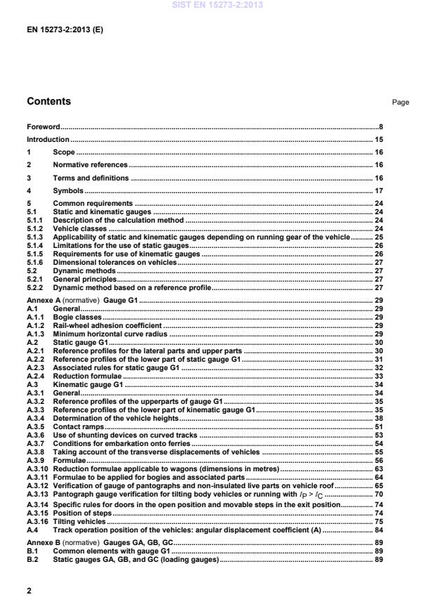 Page Foreword .8 Introduction . 15 1 Scope . 16 2 Normative references . 16 3 Terms and definitions . 16 4 Symbols . 17 5 Common requirements . 24 5.1 Static and kinematic gauges . 24 5.1.1 Description of the calculation method . 24 5.1.2 Vehicle classes . 24 5.1.3 Applicability of static and kinematic gauges depending on running gear of the vehicle . 25 5.1.4 Limitations for the use of static gauges . 26 5.1.5 Requirements for use of kinematic gauges . 26 5.1.6 Dimensional tolerances on vehicles . 27 5.2 Dynamic methods . 27 5.2.1 General principles. 27 5.2.2 Dynamic method based on a reference profile . 27 Annexe A (normative)