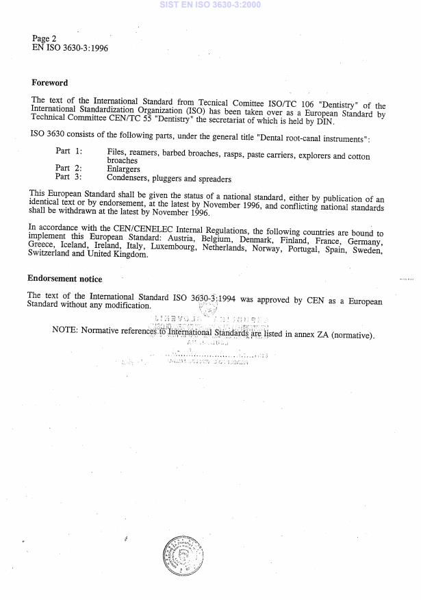 EN ISO 3630-3:1996 is a standard published by the European Committee for Standardization (CEN). Its full title is "Dental root-canal instruments - Part 3: Condensers, pluggers and spreaders (ISO 3630-3:1994)". This standard covers: Specifies requirements and test methods for pluggers and spreaders, used to condense root-canal filling materials. Includes, additional to standard sizes, a secondary size system referred to as "taper size". These "taper size" sizes are identifiable by tapers which vary with instrument size.