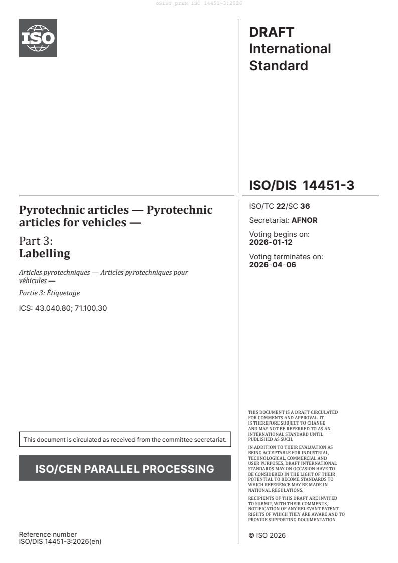 prEN ISO 14451-3: Pyrotechnic articles - Pyrotechnic articles for vehicles - Part 3: Labelling (ISO/DIS 14451-3:2026) sets out the labelling requirements for pyrotechnic articles intended for use in vehicles. Developed by CEN and ISO Technical Committee 22/SC 36, this draft international standard ensures that essential product information and safety instructions are communicated accurately on pyrotechnic devices such as airbag inflators, seatbelt pretensioners, and gas generators.
