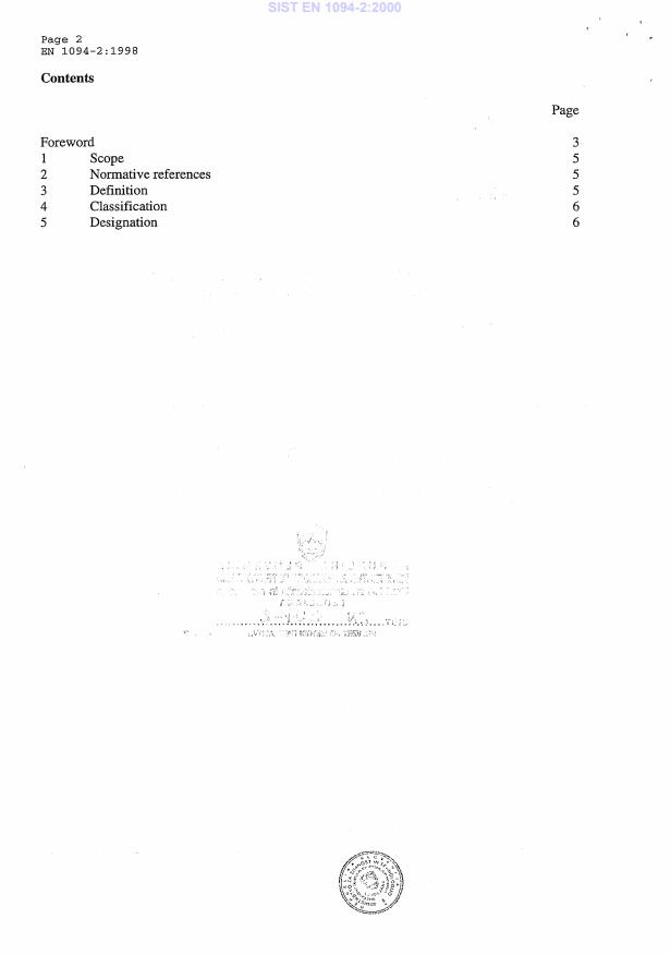 EN 1094-2:1998 is a standard published by the European Committee for Standardization (CEN). Its full title is "Insulating refractory products - Part 2: Classification of shaped products (ISO 2245:1990 modified)". This standard covers: This European Standard specifies a classification of shaped insulating refractory products, based on the determintaion of permanent change in dimension on heating, with a secondary classification based on bulk density to cover lightweight products (Class L). Products composed of ceramic fibres are excluded.