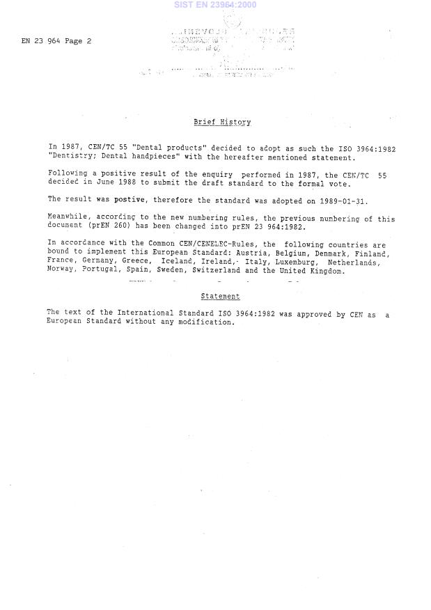 EN 23964:1989 is a standard published by the European Committee for Standardization (CEN). Its full title is "Dentistry - Dental handpieces - Coupling dimensions (ISO 3964:1982)". This standard covers: Specifies the nominal dimensions and tolerances of the swivel-type coupling used between the dental handpieces and their driving mechanisms. It is not applicable to the older "slip-joint" coupling and restricted to mechanically coupled handpieces of the slow or medium speed types.