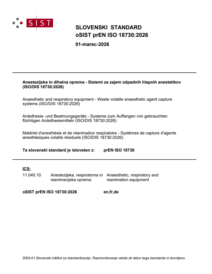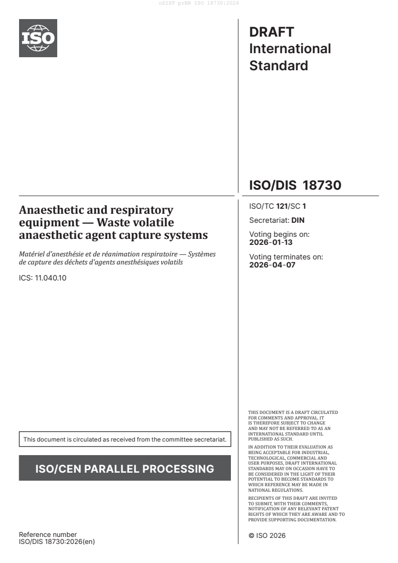prEN ISO 18730 is a draft published by the European Committee for Standardization (CEN). Its full title is "Anaesthetic and respiratory equipment - Waste volatile anaesthetic agent capture systems (ISO/DIS 18730:2026)". This standard covers: This document specifies requirements for waste volatile anaesthetic agent capture systems that may or may not include the recycling of the collected volatile anaesthetic agent for reuse. NOTE 1: Waste volatile agent capture systems, that are part of a medical gas pipeline system as specified in ISO 7396-1 [4], are outside the scope of this document. NOTE 2: Nitrous oxide is not considered to be a volatile anaesthetic agent.