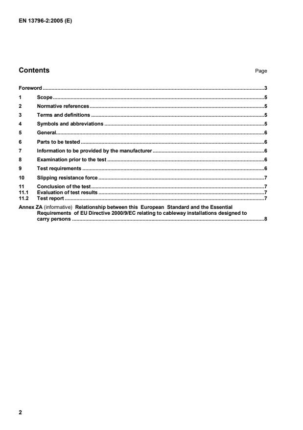 EN 13796-2:2005 is a standard published by the European Committee for Standardization (CEN). Its full title is "Safety requirements for cableway installations designed to carry persons - Carriers - Part 2: Slipping resistance test for grips". This standard covers: This European Standard specifies the safety requirements applicable to carriers for cableway installations designed to carry persons. This standard is applicable to the various types of installations and takes into account their environment. This Part describes the requirements to be met when testing the slipping resistance of grips clamped - on the haulage or carrying hauling rope of carriers of monocable or bicable aerial ropeways with fixed or detachable grips, covered by 7.4 of Part 1 of this standard; - on the towing rope of ski-tows with fixed grips, covered by 7.6.2 of Part 1 of this standard. It does not apply to installations for the transportation of goods nor to inclined lifts.