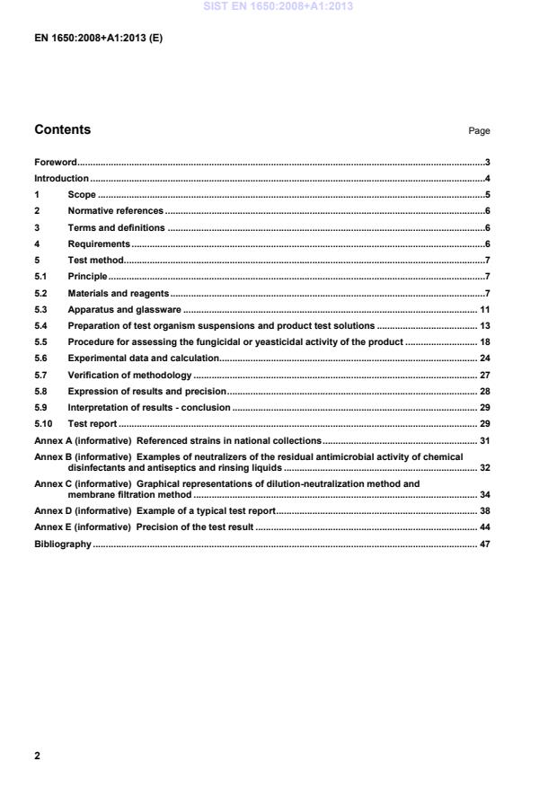 2003-01.Slovenski inštitut za standardizacijo. Razmnoževanje celote ali delov tega standarda ni dovoljeno.Chemische Desinfektionsmittel und Antiseptika - Quantitativer Suspensionsversuch zur Bestimmung der fungiziden oder levuroziden Wirkung chemischer Desinfektionsmittel und Antiseptika in den Bereichen Lebensmittel, Industrie, Haushalt und öffentliche Einrichtungen - Prüfverfahren und Anforderungen (Phase 2, Stufe 1)Antiseptiques et désinfectants chimiques - Essai quantitatif de suspension pour l'évaluation de l'activité fongicide ou levuricide des antiseptiques et des désinfectants chimiques utilisés dans le domaine de l'agro-alimentaire, dans l'industrie, dans les domaines domestiques et en collectivité - Méthode d'essai et prescriptions (phase 2, étape 1)Chemical disinfectants and antiseptics - Quantitative suspension test for the evaluation of fungicidal or yeasticidal activity of chemical disinfectants and antiseptics used in food, industrial, domestic and institutional areas - Test method and requirements (phase 2, step 1)71.100.35Kemikalije za dezinfekcijo v industriji in domaChemicals for industrial and domestic disinfection purposesICS:Ta slovenski standard je istoveten z:EN 1650:2008+A1:2013SIST EN 1650:2008+A1:2013en,fr,de01-julij-2013SIST EN 1650:2008+A1:2013SLOVENSKI