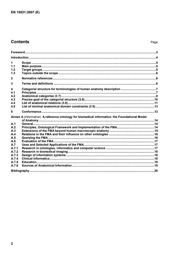 1.1 Main purpose This European standard defines the characteristics required to synthetically describe the organisation and content of human anatomy within a terminological system. It is intended primarily for use with computer-based applications such as clinical electronic health records, decision support and for various bio-medical research purposes. This European standard will serve to - facilitate the construction of new terminological systems in a regular form which will increase their coherence and expressiveness; - facilitate maintenance of human anatomy within terminological systems; - increase consistency and coherence of existing terminological system; - allow systematic cross-references between items of human anatomy in different types of terminological systems; - facilitate convergence among human anatomy within terminological systems; - make explicit the overlap for human anatomy between different health care domains terminological systems; - provide elements for negotiation about integration of different terminological systems into information systems between the respective developers; - enable the systematic evaluation of human anatomy within terminological systems. 1.2 Target groups The European standard itself is not suitable or intended for use by, individual clinicians or hospital administrators. The target groups for this European standard are: - designers of specialised standard healthcare terminological categorial structures; - developers of healthcare terminological systems including classifications and coding systems; - producers of services for terminological systems and designers of software including natural language processing; - information modellers, knowledge engineers, and standards developers building models for health information management systems; - developers of information systems that require an explicit representation of healthcare terminological systems; - developers of marked-up standards for represent