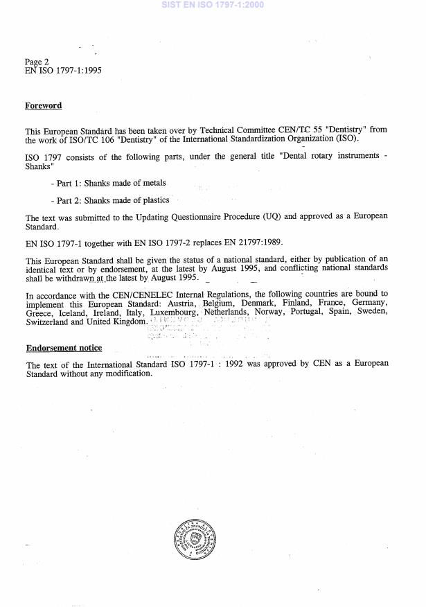 EN ISO 1797-1:1995 is a standard published by the European Committee for Standardization (CEN). Its full title is "Dental rotary instruments - Shanks - Part 1: Shanks made of metals (ISO 1797-1:1992)". This standard covers: Specifies four types. Gives measurement methods for the verification of dimensions. Includes quality control requirements.
