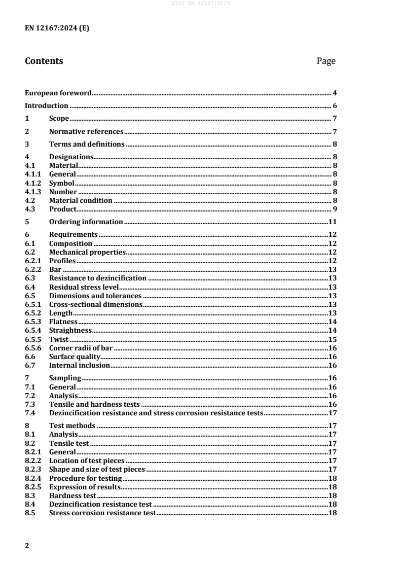 EN 12167:2024 is a standard published by the European Committee for Standardization (CEN). Its full title is "Copper and copper alloys - Profiles and bars for general purposes". This standard covers: This European Standard specifies the composition, property requirements and dimensional tolerances for copper alloy profiles including L-, T-, U-shaped cross-sections, and bars, finally produced by drawing or extruding. This European Standard applies to profiles with L-, T- and U-shaped cross-sections which would fit within a circumscribing circle of a maximum 180 mm diameter and to bars with thicknesses from 3 mm up to and including 60 mm and with widths from 6 mm up to and including 120 mm. The sampling procedures, the methods of test for verification of conformity to the requirements of this European Standard, are also specified.