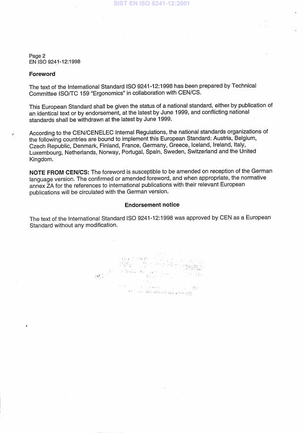 EN ISO 9241-12:1998 is a standard published by the European Committee for Standardization (CEN). Its full title is "Ergonomic requirements for office work with visual display terminals (VDTs) - Part 12: Presentation of information (ISO 9241-12:1998)". This standard covers: Migrated from Progress Sheet (TC Comment) (2000-07-10): Following BT 125/1992, this part of ISO 9241 will undergo a parallel CEN/ISO ++ voting procedure.