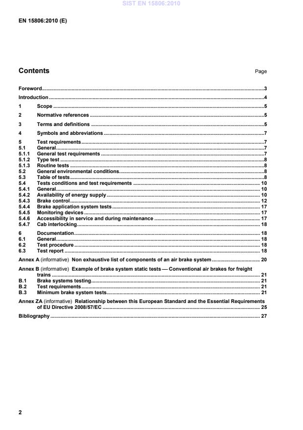 EN 50125-1 Railway applications — Environmental conditions for equipment — Part 1: Equipment on board rolling stock ISO 8573-1, Compressed air — Part 1: Contaminants and purity classes 3 Terms and definitions For the purposes of this document, the terms and definitions given in EN 14478:2005 and the following apply. 3.1 brake test test which aims to prove that a brake system complies with the requirements in terms of function and performance NOTE The brake tests may comprise: - type test; - routine tests. SIST EN 15806:2010