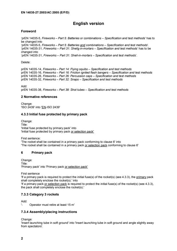 ‘prEN 14035-5, Fireworks – Part 5: Batteries or combinations – Specification and test methods’ has to be changed into ‘prEN 14035-5, Fireworks – Part 5: Batteries and combinations – Specification and test methods’. ‘prEN 14035-31, Fireworks – Part 31: Shells-in-mortars – Specification and test methods’ has to be changed into ‘prEN 14035-31, Fireworks – Part 31: Shell-in-mortars – Specification and test methods’.