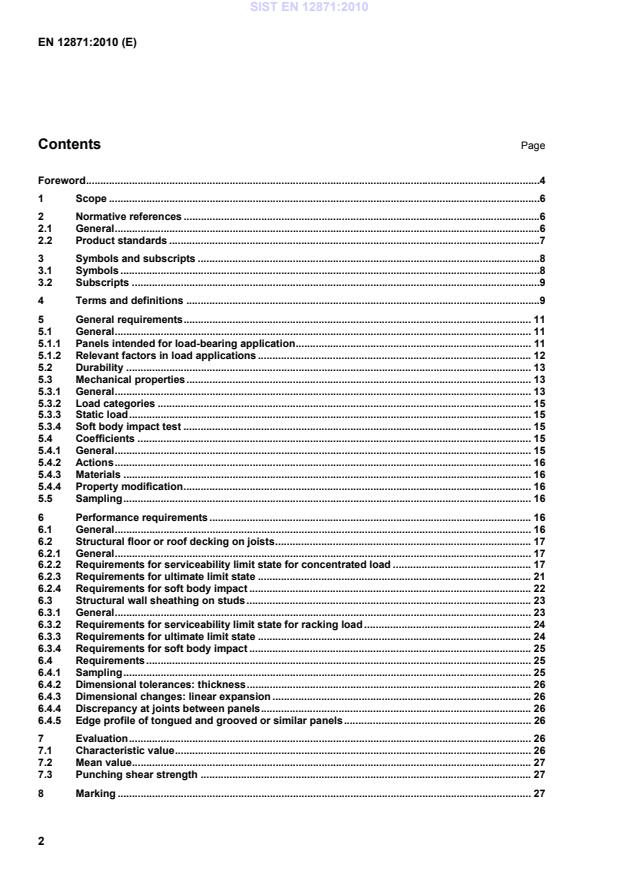 EN 12871:2010 is a standard published by the European Committee for Standardization (CEN). Its full title is "Wood-based panels - Performance specifications and requirements for load bearing boards for use in floors, walls and roofs". This standard covers: This European Standard specifies the performance requirements and the procedure for demonstrating compliance, through type testing, of load-bearing wood-based panels fitted on: a) structural joists for decking: - in flooring applications in categories of use A, B, C and D; - in roof applications in categories of use H and I; for which type testing involves: - punching shear under concentrated loading; - vertically dropped soft body impact; b) studs for walling application for which type testing involves: - racking behaviour; - pendular soft body impact. This European Standard also provides a calculation method related to soft overlays that may be installed on roofs or floors with uniform loading. NOTE Soft body impact, addressing safety matters both during construction and in service, is defined in EN 1990 and EN 1991-1. Annex A (normative) lists the contact areas of the loading heads that may be used for concentrated loading. Annex B (informative) provides examples for a decking application in a floor and a roof.