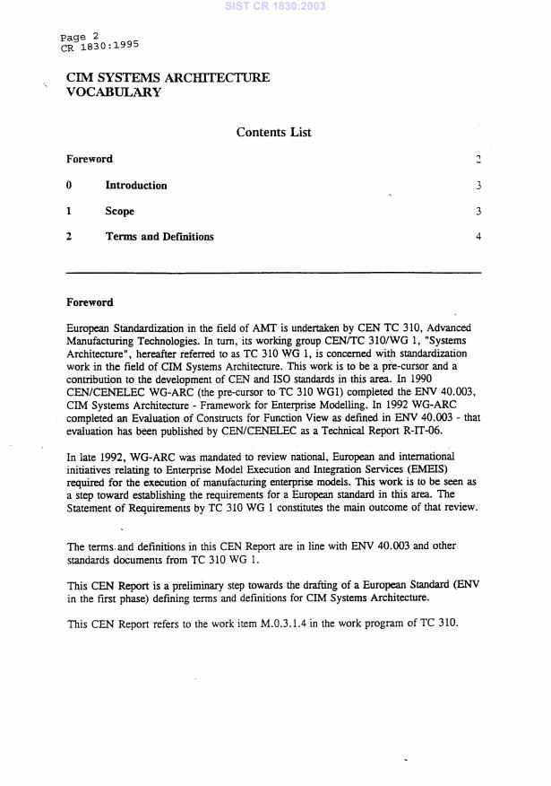 CR 1830:1995 is a standardization document published by the European Committee for Standardization (CEN). Its full title is "CIM Systems Architecture - Vocabulary". This standard covers: This CEN Report includes terms and definitions for currently used concepts relating to CIM Systems Architecture, Enterprise Modelling and Enterprise Models Execution and Integrating Services, as required by Advanced Manufacturing Technologies.