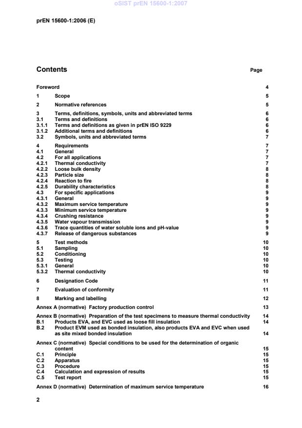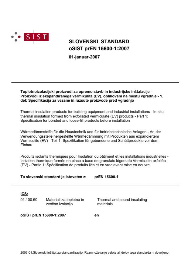 prEN 15600-1 is a draft published by the European Committee for Standardization (CEN). Its full title is "Thermal insulation products for building equipment and industrial installations - In-situ thermal insulation formed from exfoliated vermiculate (EV) products - Part 1: Specification for bonded and loose-fill products before installation". This standard covers: 2009-03-05 EMA: Deletion of WI following 3-YT. Tolerance of 9 months before FV (resolution CEN/TC 88 398/2008) (note by SV on 2008-04-18) 2007-06-15: ADC: DOW= DAV+21 months