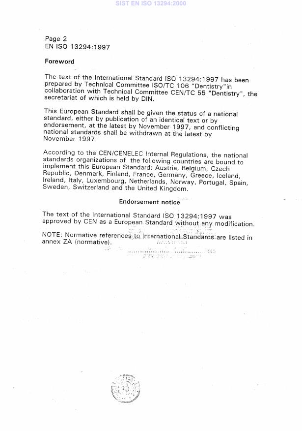 0 IS0 IS0 13294: 1997(E) Foreword IS0 (the International Organization for Standardization) is a worldwide federation of national standards bodies (IS0 member bodies). The work of preparing International Standards is normally carried out through IS0 technical committees. Each member body interested in a subject for which a technical committee has been established has the right to be represented on that committee. International organizations, governmental and non-governmental, in liaison with ISO, also take part in the work. IS0 collaborates closely with the International Electrotechnical Commission (IEC) on all matters of electrotechnical standardization. Draft International Standards adopted by the technical committees are circulated to the member bodies for voting. Publication as an International Standard requires approval by at least 75 % of the member bodies casting a vote. International Standard IS0 13294 was prepared by Technical Committee lSO/TC 106, Dentistry, Subcommittee SC 4, Dental instruments. Annex A of this International Standard is for information only. SIST EN ISO 13294:2000