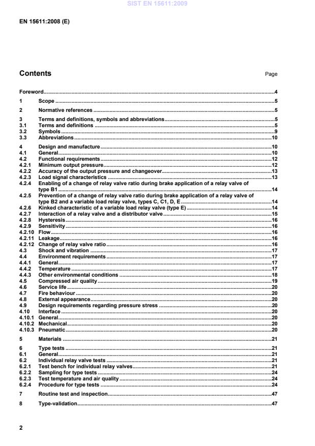 Continuously changing relay valve ratio, with a multi stage feature added 3.1.6.4 Multi stage variable load relay valve As for Type C plus 4.2.2.3 As for Type C plus 6.2.4.10 D Two or more input pressures with „select high“ feature overlay function to type A – C 3.1.6.5 Two (multi) input relay valveAs for Type A, B or C plus 4.2.2.4 As for Type A, B or C plus 6.2.4.13 E Kinked characteristic additional overlay function to type C 3.1.6.6 Variable load relay valve with kinked characteristic As for Type C plus 4.2.6 As for Type C plus 6.2.4.9 SIST EN 15611:2009