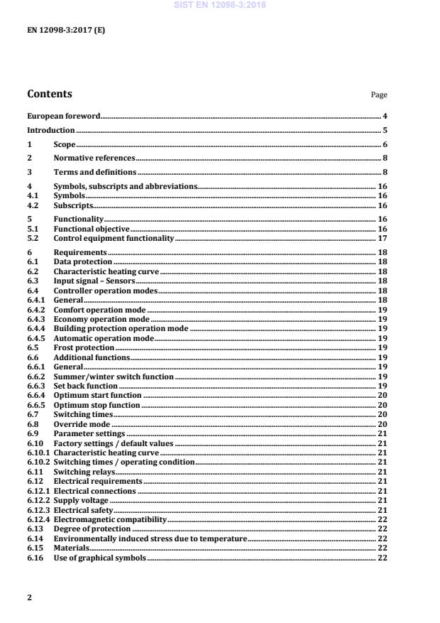 Economy operation mode is a reduced mode. 3.12 building protection operation mode mode of operation between the switch-off time and the switch-on time, maintaining a room temperature required for building protection 3.13 automatic operation mode mode of operation of equipment when significant control functions are not overridden by the user Note 1 to entry: The operation mode is selected automatically according to the scheduler, actual date and time. 3.14 summer/winter switch function seasonal switch on/off of the heating depending on a function of the outside air temperature 3.15 set back function function, starting when the operation mode changes from comfort to economy or building protection mode Note 1 to entry: During set back period, the heating is switched off until the calculated or measured room temperature drops below the economy or building protection setpoint; the operation mode switches back to comfort mode or the calculated switch-on time of the optimization start function is reached. SIST EN 12098-3:2018