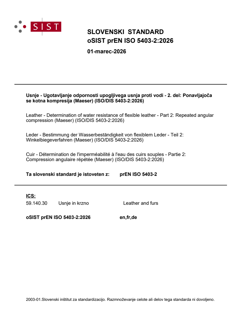 prEN ISO 5403-2 is a draft published by the European Committee for Standardization (CEN). Its full title is "Leather - Determination of water resistance of flexible leather - Part 2: Repeated angular compression (Maeser) (ISO/DIS 5403-2:2026)". This standard covers: ISO 5403-2:2011 specifies a method for determining the dynamic water resistance of leather by means of repeated angular compression. It is applicable to all flexible leathers but is particularly suitable for leathers intended for footwear applications. It uses a Maeser-type machine and includes an option for electronic detection.
