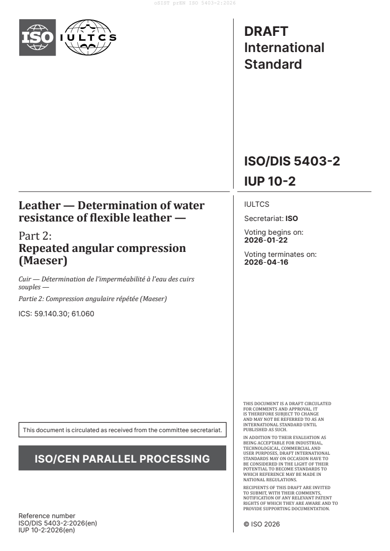 prEN ISO 5403-2:2026 specifies a standardized method for determining the dynamic water resistance of flexible leather using repeated angular compression. Developed by the European Committee for Standardization (CEN) and aligned with ISO/DIS 5403-2, this standard plays a key role in evaluating the suitability of leather-particularly for footwear applications-when exposed to flexing and water. The test method employs a Maeser-type machine and allows for either visual or electronic detection of water penetration, providing a consistent and reliable approach for manufacturers, testing laboratories, and quality assurance professionals.