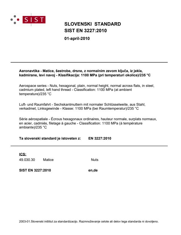 2003-01.Slovenski inštitut za standardizacijo. Razmnoževanje celote ali delov tega standarda ni dovoljeno.Luft- und Raumfahrt - Sechskantmuttern mit normaler Schlüsselweite, aus Stahl, verkadmet, Linksgewinde - Klasse: 1100 MPa (bei Raumtemperatur)/235 °CSérie aérospatiale - Écrous hexagonaux ordinaires, hauteur normale, surplats normaux, en acier, cadmiés, filetage à gauche - Classification: 1100 MPa (à température ambiante)/235 °CAerospace series - Nuts, hexagonal, plain, normal height, normal across flats, in steel, cadmium plated, left hand thread - Classification: 1100 MPa (at ambient temperature)/235 °C49.030.30MaticeNutsICS:Ta slovenski standard je istoveten z:EN 3227:2010SIST EN 3227:2010en,de01-april-2010SIST EN 3227:2010SLOVENSKI