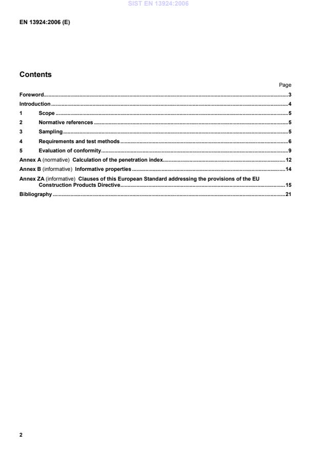 This framework covers three essential characteristics according to the mandate M/124: EU Construction Products Directive 89/106/EEC : "Consistency at intermediate service temperature"; "Consistency at elevated service temperature"; "Durability" of the above. 2 Normative references The following referenced documents are indispensable for the application of this document. For dated references, only the edition cited applies. For undated references, the latest edition of the referenced document (including any amendments) applies. EN 58, Bitumen and bituminous binders – Sampling bituminous binders EN 1426, Bitumen and bituminous binders – Determination of needle penetration EN 1427, Bitumen and bituminous binders – Determination of the softening point – Ring and Ball method EN 12592, Bitumen and bituminous binders – Determination of solubility EN 12593, Bitumen and bituminous binders – Determination of the Fraass breaking point EN 12594, Bitumen and bituminous binders – Preparation of test samples EN 12595, Bitumen and bituminous binders – Determination of kinematic viscosity EN 12596, Bitumen and bituminous binders – Determination of dynamic viscosity by vacuum capillary EN 12597, Bitumen and bituminous binders – Terminology EN 12607-1, Bitumen and bituminous binders – Determination of the resistance to hardening under the influence of heat and air – Part 1: RTFOT method EN 12607-3, Bitumen and bituminous binders – Determination of the resistance to hardening under influence of heat and air – Part 3: RFT method prEN 15326, Bitumen and bituminous binders – Measurement of density and specific gravity – Capillary-stoppered pyknometer method EN ISO 2592, Determination of flash and fire points - Cleveland open cup method (ISO 2592:2000) EN ISO 4259, Petroleum products - Determination and application of precision data in relation to methods of test (ISO/DIS 4259:2004)EN ISO 9001, Quality management systems - Requirements (ISO 9001:2000) 3 Terms and definitions For the purposes of this document, the terms and definitions given in EN 12597 apply. SIST EN 13924:2006