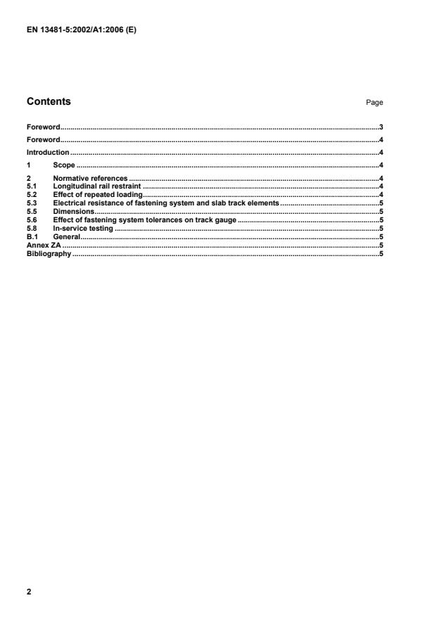 EN 13481-5:2002/A1:2006 is a amendment published by the European Committee for Standardization (CEN). Its full title is "Railway applications - Track - Performance requirements for fastening systems - Part 5: Fastening systems for slab track". This standard covers: This European Standard is applicable to fastening systems for use in attaching rails to the uppermost surface of concrete or asphalt slabs in non-ballasted track construction as follows: ¾ main lines having radius of curvature greater than 150 m and subject to maximum design axle load of 260 kN; ¾ light rail systems having a radius of curvature greater than 40 m and subject to a maximum design axle load of 130 kN. This includes fastening systems for floating slabs but does not include fastening systems for embedded rails. The requirements apply to the following: a) direct fastening systems; b) indirect fastening systems; c) fastening systems for the rail sections in prEN 13674-1 and prEN 13674-4; d) fastening systems which incorporate concrete elements which each have not more than one supporting element per rail. In the case of (d) the concrete element is considered to be part of the fastening system. If the system includes concrete elements which each have more than one supporting location per rail, those concrete elements are considered to be part of the slab and not part of the fastening system. This standard is not applicable to special fastening systems used at bolted joints. This standard is for type approval of a complete fastening assembly only.