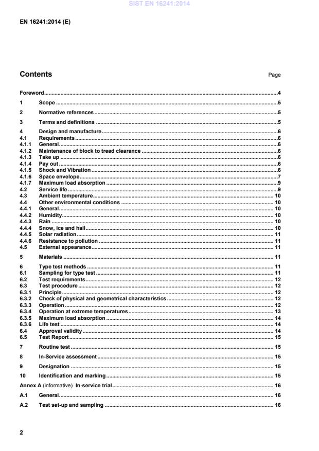 Foreword .4 1 Scope .5 2 Normative references .5 3 Terms and definitions .5 4 Design and manufacture .6 4.1 Requirements .6 4.1.1 General .6 4.1.2 Maintenance of block to tread clearance .6 4.1.3 Take up .6 4.1.4 Pay out .6 4.1.5 Shock and Vibration .6 4.1.6 Space envelope .7 4.1.7 Maximum load absorption .9 4.2 Service life .9 4.3 Ambient temperature . 10 4.4 Other environmental conditions . 10 4.4.1 General . 10 4.4.2 Humidity . 10 4.4.3 Rain . 10 4.4.4 Snow, ice and hail . 10 4.4.5 Solar radiation . 11 4.4.6 Resistance to pollution . 11 4.5 External appearance . 11 5 Materials . 11 6 Type test methods . 11 6.1 Sampling for type test . 11 6.2 Test requirements . 12 6.3 Test procedure . 12 6.3.1 Principle . 12 6.3.2 Check of physical and geometrical characteristics . 12 6.3.3 Operation . 12 6.3.4 Operation at extreme temperatures . 13 6.3.5 Maximum load absorption . 14 6.3.6 Life test . 14 6.4 Approval validity . 14 6.5 Test Report . 15 7 Routine test . 15 8 In-Service assessment . 15 9 Designation . 15 10 Identification and marking . 15 Annex A (informative)