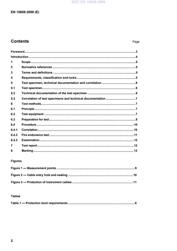 The method of test is specified to determine the ability of light fire storage units to protect paper media from the effects of fire. Two levels of fire exposure periods (LFS 30 P and LFS 60 P) are specified using the maximum temperature increase permitted within the storage space of the light fire storage unit. Requirements are also specified for the test specimen, the technical documentation for the test specimen, correlation of the test specimen with the technical documentation, preparation for type testing and test procedures. A scheme to classify the light fire storage units from the test results is also given (see Table 1). 2 Normative references The following referenced documents are indispensable for the application of this document. For dated references, only the edition cited applies. For undated references, the latest edition of the referenced document (including any amendments) applies. EN 1363-1:1999, Fire resistance tests — Part 1: General requirements EN 60584-1, Thermocouples — Part 1: Reference tables (IEC 60584-1:1995). 3 Terms and definitions For the purposes of this document, the following terms and definitions apply. 3.1 light fire storage unit storage unit designed to protect paper media, except for paper grades where data loss occurs at temperatures below 172°C, as well as valuables against the effects of temperatures up to 172°C NOTE A light fire storage unit can have doors, drawers, lids, connections and fittings. 3.2 compartment part of a light fire storage unit which can be closed with a separate door, lid or cover NOTE A compartment formed by inserting a shelf board is not a compartment within the meaning of this standard. 3.3 lock device which verifies an entered code and performs a blocking function on the boltwork or the door 4 Requirements, classification and locks 4.1 Light fire storage units shall provide protection against the effects of fire (see Clause 6) and be classified as specified in Table 1. SIST EN 15659:2009