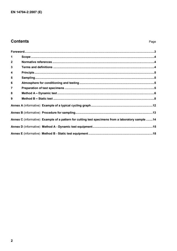 Two methods are specified, one a dynamic method (method A) and the other a static method (method B). The results obtained cannot be compared. The choice of method should be agreed between parties and indicated in the test report. 2 Normative references The following referenced documents are indispensable for the application of this document. For dated references, only the edition cited applies. For undated references, the latest edition of the referenced document (including any amendments) applies. EN 14704-1, Determination of the elasticity of fabrics — Part 1: Strip tests EN ISO 139, Textiles — Standard atmospheres for conditioning and testing (ISO 139:2005) EN ISO 7500-1, Metallic materials — Verification of static uniaxial testing machines — Part 1: Tension/compression testing machines — Verification and calibration of the force-measuring system
