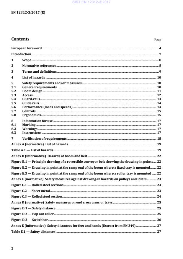 EN ISO 13849-1:2015, Safety of machinery - Safety-related parts of control systems - Part 1: General - EN ISO 13850:2015, Safety of machinery - Emergency stop function - Principles for d EN ISO 14122-1, Safety of machinery - Permanent means of access to machinery - Part 1: Choice of fixed - ISO 11532:2012, Aircraft ground equipment — Graphical symbols ISO 11228-1, Ergonomics — Manual handling — Part 1: Lifting and carrying ISO 11228-3, Ergonomics — Manual handling — Part 3: Handling of low loads at high frequency DIN 51130:2014-02, Testing of floor coverings — Determination of the anti-slip property — Workrooms and fields of activities with slip danger — Walking method — Ramp test 3 Terms and definitions For the purposes of this document, the terms and definitions given in EN ISO 12100 and EN 1915-1:2013 and the following apply. 3.1 conveyor belt vehicle vehicle comprising a chassis, a boom with a belt, and a lifting device 3.2 boom load carrying assembly which includes a belt to move the load, and any possible tray attached to it 3.3 telescopic boom load carrying assembly, adjustable in length 3.4 lifting device system to vary the height of the boom 3.5 incline angle of the boom to a horizontal plane 3.6 guide rail lateral device attached to the boom to prevent loads from falling off the sides 3.7 tray loading platform fitted at either end of the boom and independent of the belt SIST EN 12312-3:2017