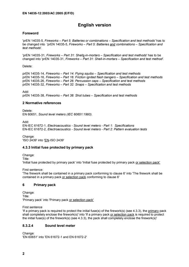 EN 14035-12:2003/AC:2005 is a corrigendum published by the European Committee for Standardization (CEN). Its full title is "Fireworks - Part 12: Flash bangers and flash banger batteries - Specification and test methods". This standard covers: TC - Update of list in foreword, normative ref., 4.3.3, Clause 6, 8.3.2.4, etc.