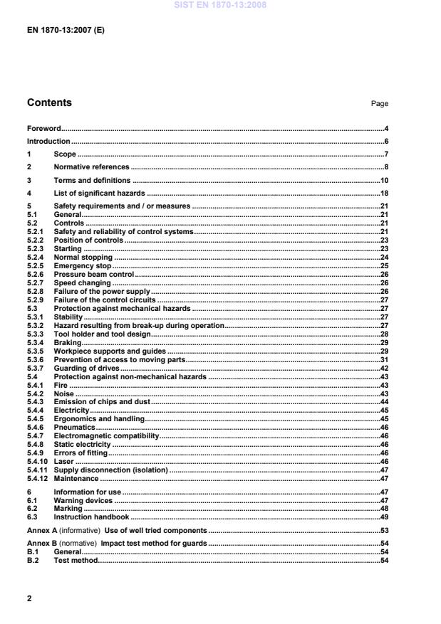 EN ISO 12100-2:2003 for hazards relevant but not significant, which are not dealt with by this document (e.g. sharp edges of the machine frame). NOTE 2 For guidance in connection with risk reduction by design see Clause 4 of EN ISO 12100-2:2003 and for safeguarding measures see Clause 5 of EN ISO 12100-2:2003. 5.2 Controls 5.2.1 Safety and reliability of control systems 5.2.1.1 General For the purpose of this document safety related part of a control system means the system from the initial device, e.g. push button or position detector or sensor up to and including the power control element of the final machine actuator or element, e.g. motor or brake. Safety related parts of the control system of this machine comprise parts concerning the following functions and they shall fulfil the requirements of the categories given below according to EN ISO 13849-1:2006: a) for starting and restarting and for prevention of unexpected start-up after failure of power supply: category 1 or 3 (see 5.2.3, 5.2.8); b) for normal stopping: category 1 or 3 (see 5.2.4); SIST EN 1870-13:2008