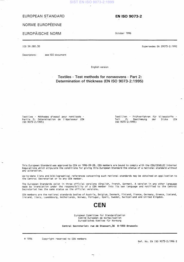 EN ISO 9073-2:1996 is a standard published by the European Committee for Standardization (CEN). Its full title is "Textiles - Test methods for nonwovens - Part 2: Determination of thickness (ISO 9073-2:1995)". This standard covers: Cancels and replaces the first edition (1989). Lays down methods for the determination of the thickness, when under a specific pressure, of normal and bulky nonwoven textiles.