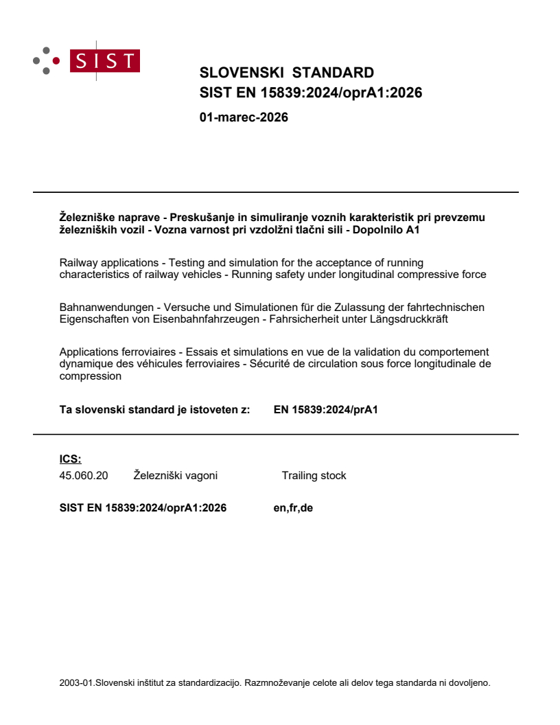 EN 15839:2024/prA1 is a European draft standard developed by CEN for the railway sector, focusing on the testing and simulation methods used to assess the running safety of railway vehicles under longitudinal compressive force (LCF). The document defines how the endurable longitudinal compressive force is determined for different types of rail vehicles, aiming to ensure safety and prevent derailment risks during operational scenarios where significant LCF may occur. The standard covers a wide range of freight rolling stock but specifically excludes locomotives and vehicles in passenger service only.