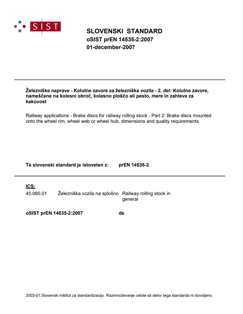 2003-01.Slovenski inštitut za standardizacijo. Razmnoževanje celote ali delov tega standarda ni dovoljeno.Bahnanwendungen - Bremsscheiben für Schienenfahrzeuge - Teil 2: Bremsscheiben, die an einem Rad befestigt werden, Abmessungen und QualitätsanforderungenApplications ferroviaires - Disques de frein pour matériel roulant ferroviaire - Partie 2: Disques de frein montés sur la roue, dimensions et exigences de qualitéRailway applications - Brake discs for railway rolling stock - Part 2: Brake discs mounted onto the wheel, dimensions and quality requirements45.040Materiali in deli za železniško tehnikoMaterials and components for railway engineeringICS:Ta slovenski standard je istoveten z:EN 14535-2:2011SIST EN 14535-2:2011en,fr,de01-november-2011SIST EN 14535-2:2011SLOVENSKI