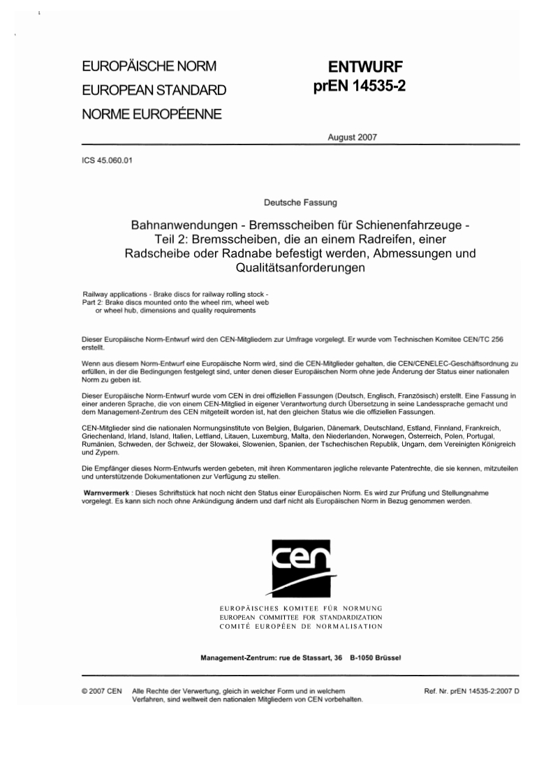 Bahnanwendungen - Bremsscheiben für Schienenfahrzeuge - Teil 2: Bremsscheiben, die an einem Rad befestigt werden, Abmessungen und Qualitätsanforderungen This European Standard was approved by CEN on 4 May 2011.