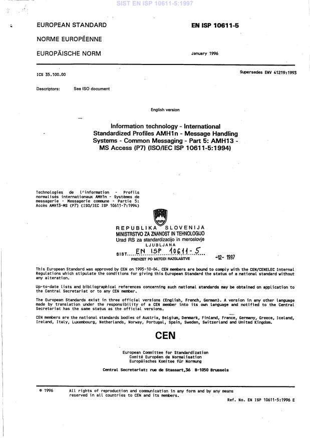 Ta slovenski standard je istoveten z: EN ISP 10611-5:1996