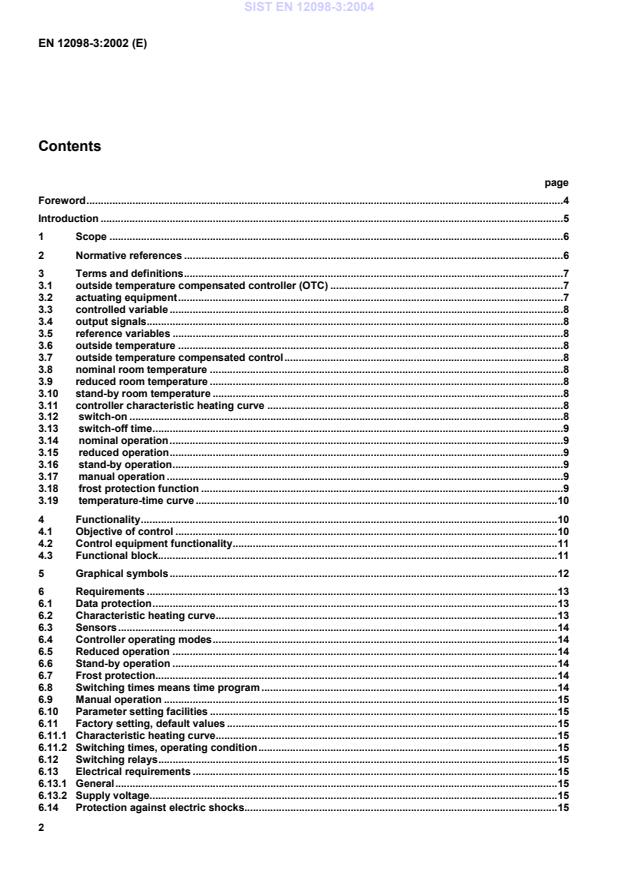 EN 12098-3:2002 is a standard published by the European Committee for Standardization (CEN). Its full title is "Controls for heating systems - Part 3: Outside temperature compensated control equipment for electrical heating systems". This standard covers: This work item applies to electronic control equipment for electrical heating systems. The signals can be processed by analogue or digital techniques. This control equipment controls and regulates the distribution and/or the generation of heat in relation to the outside temperature and/or other reference variables (e.g. room temperature, emitter temperature...) and time. Safety requirements on heating systems remain unaffected by this standard. The dynamic behaviour of the actuators is not covered here. The control equipment may or may not be connected to a data network.