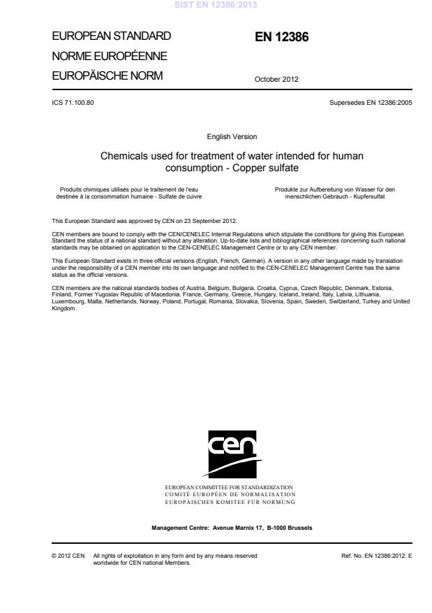 EN 12386:2012 is a standard published by the European Committee for Standardization (CEN). Its full title is "Chemicals used for treatment of water intended for human consumption - Copper sulfate". This standard covers: This European Standard is applicable to copper (II) sulfate pentahydrate used for treatment of water intended for human consumption. It describes the characteristics and specifies the requirements of copper (II) sulfate pentahydrate and refers to the corresponding analytical methods. It gives information for its use in water treatment. It also determines the rules relating to safe handling and use of copper (II) sulfate pentahydrate (see Annex B).