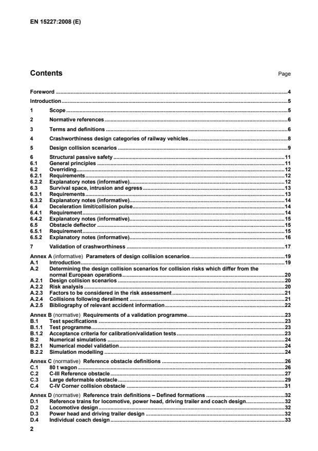 Tables Table 1 — Crashworthiness design categories of railway vehicles.8 Table 2 — Collision scenarios and collision obstacles.10 Table 3 — Obstacle deflector performance requirements.11 Table ZA.1 — Correspondence between this European Standard and Directive 96/48/EC as amended by Directive2004/50/EC.36