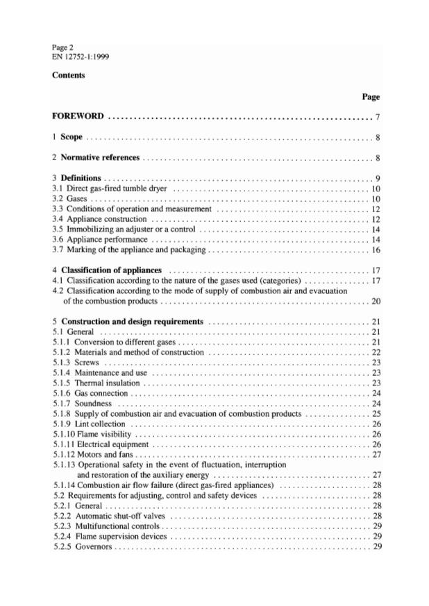 EN 12752-1:1999 is a standard published by the European Committee for Standardization (CEN). Its full title is "Gas-fired type B tumble dryers of nominal heat input not exceeding 20 kW - Part 1: Safety". This standard covers: This European Standard specifies the requirements and test methods for the construction, safety and marking of gas-fired type B tumble dryers not exceeding a nominal heat input of 20 kW and with drum volume not exceeding 350 l, hereafter re~erred to as 'Appliances". This European Standard applies to types B22 and B23 direct gas-fired appliances and to types B11 and B11BS indirect gas-fired appliances. This Standard does not apply to: a) catalytic combustion appliances; b) appliances intended to be used in locations where special conditions prevail, such as the presence of a corrosive or explosive atmosphere; c) appliances of the condensing type wherein the heated air and products of combustion used for the drying process are dehumidified by cooling with water or air; d) appliances intended to be used in vehicles or on board ships or aircraft; e) appliances of types B22D and B23D This standard covers type testing only.